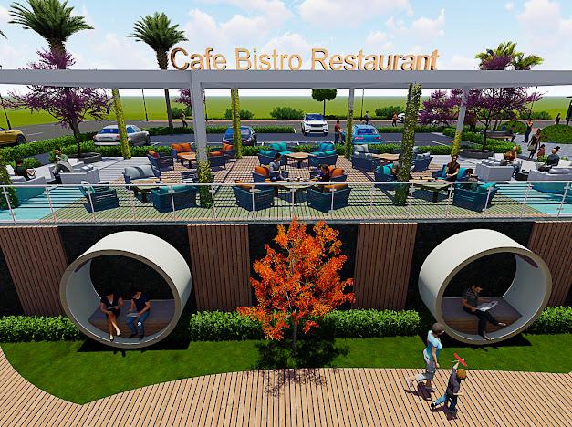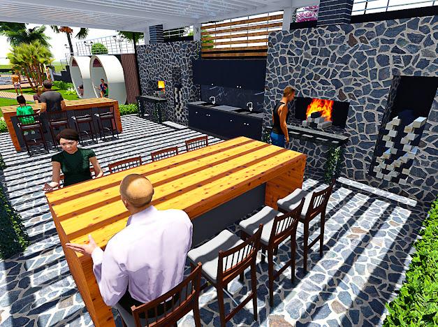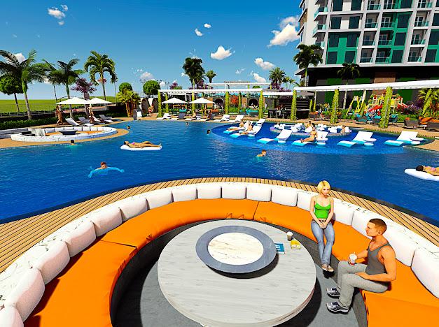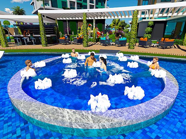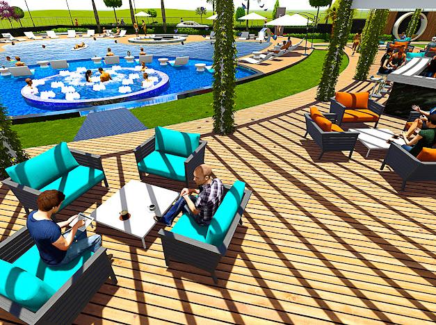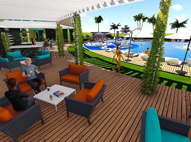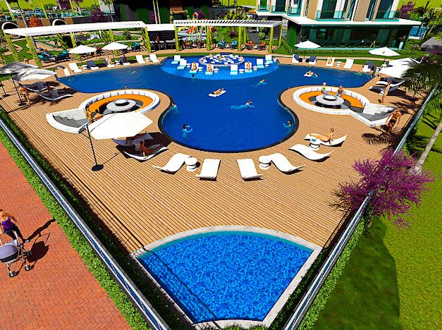 Açık teras, yüzme havuzu, havuz çevresinde şezlong ve oturma grupları, havuz bar, modern barbekü