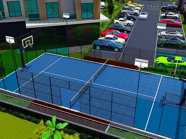 Otopark, tenis kortu, basketbol sahası,