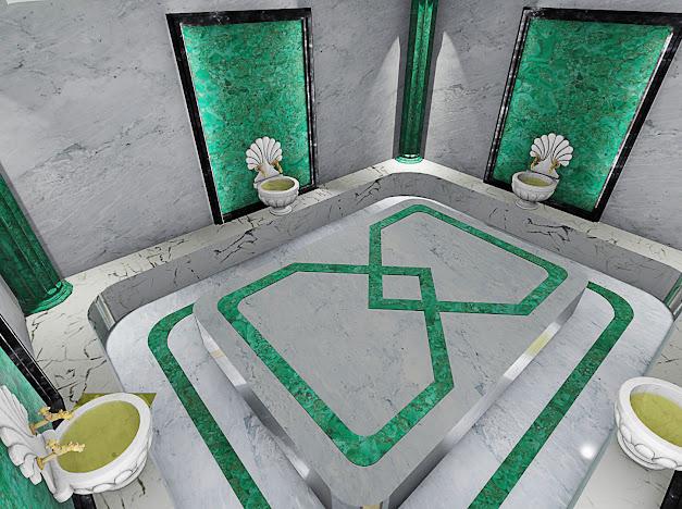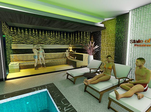 Giriş resepsiyon lobisi, Spa merkezi, bay ve bayan soyunma odaları, sauna, buhar odası, kar çeşmesi,