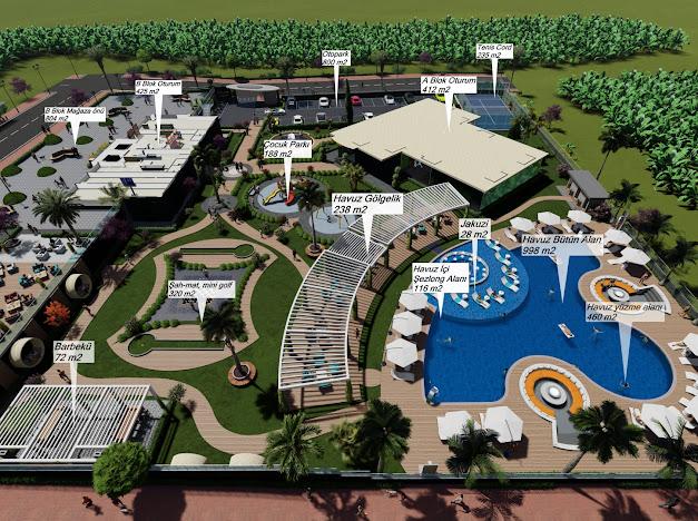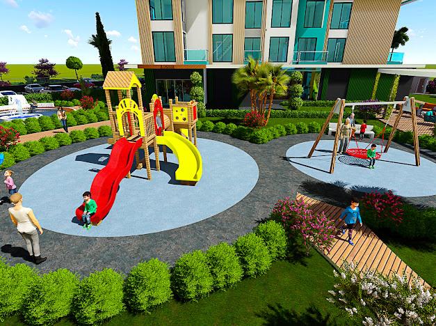 alanı, çocuk oyun alanı, bahçede mat oyun alanı, yürüyüş yolları, 7/24 güvenlik.